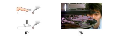 2.1細支煙燃燒錐落頭檢測技術及工藝改進 1)燃燒錐落錐檢測 根據鄭州煙草學校倪克平等的研究[4],在煙絲填充值一定的情況下, 卷煙的硬度與單支克重存在著正比關系。細支煙由于其用絲量少,卷煙硬度也隨之減少,從而細支煙從外觀表現上來看比較“脆弱”,而國產細支煙燃燒錐落頭問題也較為嚴重。由于在韓國落錐問題經常遭到用戶的投訴,細支煙燃燒落錐的測試在韓國KT&G已經作為一項重要的日常檢測指標。根據筆者的調研,國內目前對于煙支燃燒的落錐這一重要指標尚沒有相關檢測標準,鄭州煙草研究院的李斌等[5]用自制的旋轉裝置對卷煙燃燒錐落頭進行過研究分析。但是其分析過程中并沒有模擬人彈煙過程中的外加食指作用力,如圖1。從而無法模擬真實的用戶彈煙落錐過程。目前在韓國KT&G煙草人參公社,他們采用了自行研發的轉盤式20通道卷煙落錐測試分析儀對細支煙的燃燒落錐進行模擬測試分析,在完全模擬人的抽吸以及手指彈灰的條件下對卷煙落錐進行檢測。如圖2。通過這樣的模擬標準化檢測手段,韓國KT&G不斷的改善制絲和卷接的生產工藝,最終生產出優質的細支煙。
